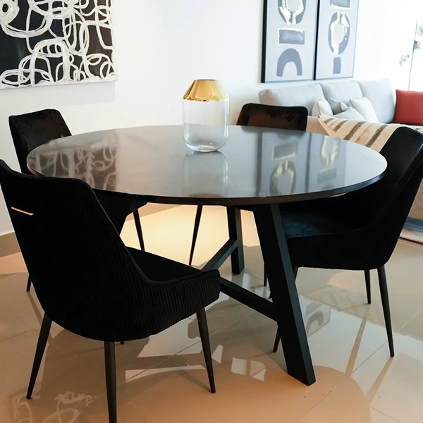Another piece of art for the living room is this enormous dining table made of MDF, A chic and unique design that will look amazing in your room. This table Mdf top and sturdy, black painted legs make it the ideal addition to any home, and its simple style goes well with a variety of opulent interior design themes.